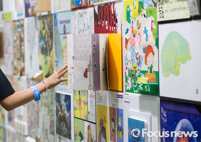 (서울=포커스뉴스) 15일 오후 서울 강남구 코엑스에서 열린 2016 서울국제도서전에서 관람객들이 전시된 책과 캘리그라피를 살펴보고 있다.
