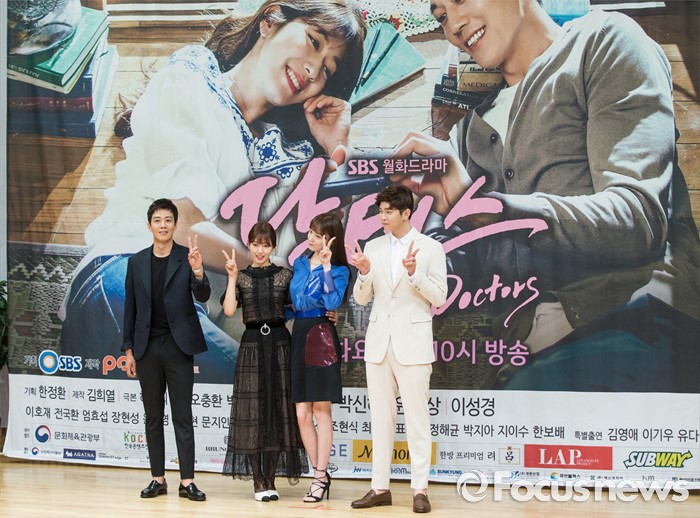 (서울=포커스뉴스) 15일 오후 서울 양천구 SBS목동사옥에서 열린 SBS 월화드라마 '닥터스' 제작발표회에 참석한 배우 김래원(왼쪽부터), 박신혜, 이성경, 윤균상이 포토타임을 갖고 있다.