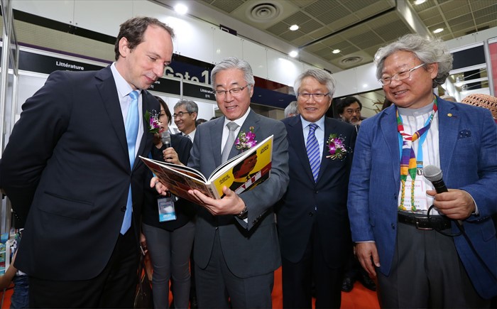 (서울=포커스뉴스) 김종덕 문화체육관광부 장관이 15일 서울 강남구 코엑스에서 열린 ‘제22회 서울국제도서전 및 제3회 디지털북페어코리아 개막식‘을 마치고 내빈들과 함께 관계자의 안내로 전시장을 둘러보고 있다. <사진제공=문화체육관광부>