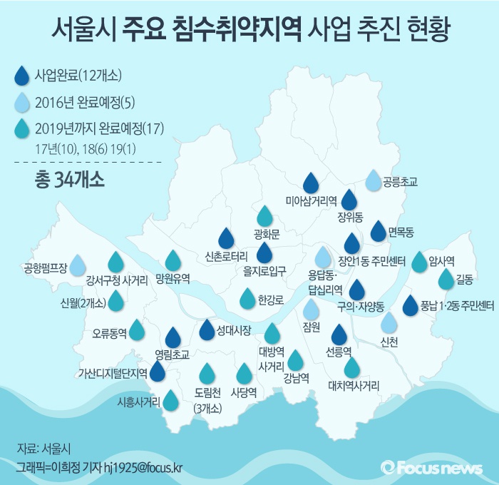 (서울=포커스뉴스) 서울시는 지난 2013년부터 상습침수지역 34곳에 대한 침수피해 예방 사업을 추진 중 이다. 시는 지난해까지 상습침수지역 34곳 중 12곳에 대한 침수피해 예방 사업을 마쳤다.