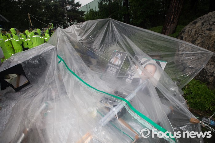 | △ 현대차 본사 앞, 쓰러진 비닐 천막 |