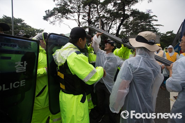 (서울=포커스뉴스) 15일 오후 유성기업 노동자 故 한광호씨의 분향소를 양재동 현대차 본사 앞으로 옮기는 꽃길 100리 행진에 참여한 노동자들이 현대차 본사 앞에서 분향소 설치로 인한 문제로 실랑이를 벌이고 있다.