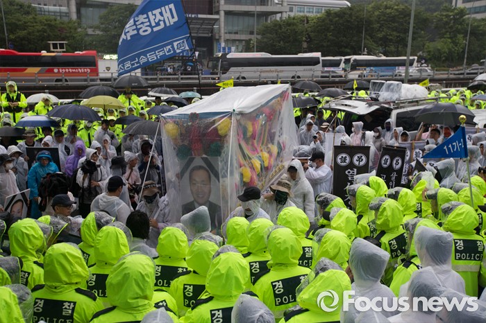 (서울=포커스뉴스) 15일 오후 유성기업 노동자 故 한광호씨의 분향소를 양재동 현대차 본사 앞으로 옮기는 꽃길 100리 행진에 참여한 노동자들이 현대차 본사 앞으로 들어서 분향소 설치로 인해 경찰과 유성 범대위 사람들이 대치하고 있다.