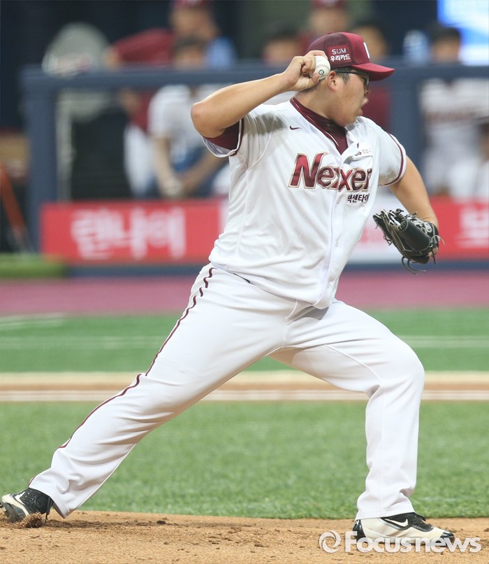(서울=포커스뉴스) 15일 서울 고척 스카이돔 구장에서 열린 2016 프로야구 롯데-넥센 경기 1회초 2사 1루에서 넥센 투수 박주현이 롯데 정훈 타석때 투구 도중 균형을 잃으며 보크를 범하고 있다.