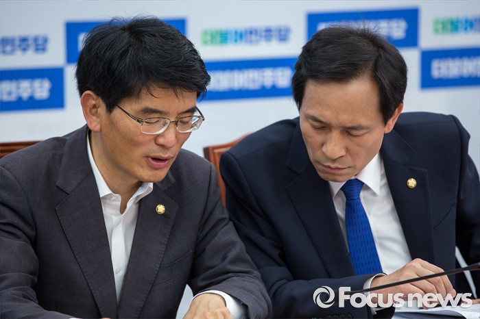 (서울=포커스뉴스) 우상호(오른쪽) 더불어민주당 원내대표와 박완주 원내수석부대표가 16일 오전 서울 여의도 국회에서 열린 정책조정회의에 참석해 대화를 나누고 있다.