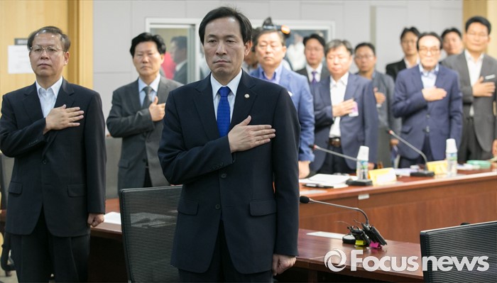 (서울=포커스뉴스) 16일 오전 서울 여의도 국회 의원회관에서 열린 남북경제협력사업 중단에 따른 손실보상에 관한 특별법안 토론회에 참석한 우상호 더불어민주당 원내대표 등 참석자들이 국기에 대한 경례를 하고 있다.