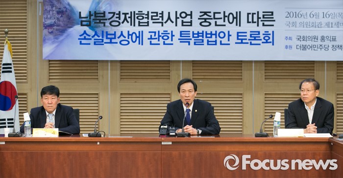 (서울=포커스뉴스) 16일 오전 서울 여의도 국회 의원회관에서 열린 남북경제협력사업 중단에 따른 손실보상에 관한 특별법안 토론회에 참석한 우상호(가운데) 더불어민주당 원내대표가 축사를 하고 있다.