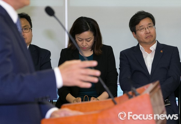(서울=포커스뉴스) 16일 오전 서울 여의도 국회 의원회관에서 열린 지방재정 개편안 무엇이 문제인가? 긴급 좌담회에 참석한 염태영(오른쪽 첫번째) 수원시장이 박광온(왼쪽 첫번째) 더불어민주당 의원의 축사를 듣고 있다.