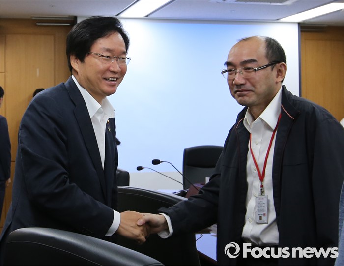 (세종=포커스뉴스) 김영석 해양수산부 장관이 16일 오전 세종시 정부세종청사 해수부 중회의실에서 열린 세월호 공정 점검회의에서 참석해 장엔 상하이샐비지 컨소시엄(SSC) 부사장과 악수하고 있다.