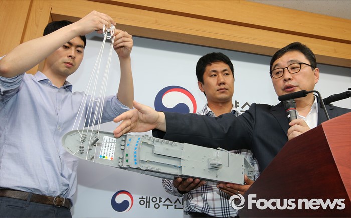 (세종=포커스뉴스) 김현태 세월호 선체인양추진단 부단장이 16일 오후 세종시 정부세종청사 해양수산부 기자실에서 세월호 선체인양에 과정을 설명하고 있다.