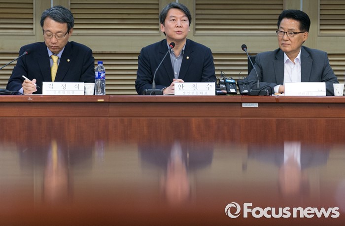 (서울=포커스뉴스) 16일 오후 서울 여의도 국회 의원회관에서 열린 '누리과정 갈등 어떻게 풀 것인가' 토론회에 참석한 안철수 국민의당 상임공동대표가 축사를 하고 있다. 왼쪽부터 김성식 정책위의장, 안 대표, 박지원 원내대표.