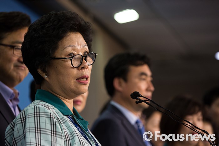 (서울=포커스뉴스) 국회 환경미화노동조합원들과 더불어민주당 을지로위원회 소속 위원들이 16일 오후 서울 여의도 국회에서 정세균 국회의장의 국회 환경미화원 직접고용 입장 발표에 환영의 뜻을 밝히는 기자회견을 하고 있다.