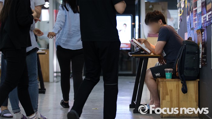 (서울=포커스뉴스) 지방직 9급 공무원 필기시험을 이틀 앞둔 15일 오후 서울 동작구 공단기 노량진학원에서 한 시험 응시자가 복도에 앉아 자습하고 있다.