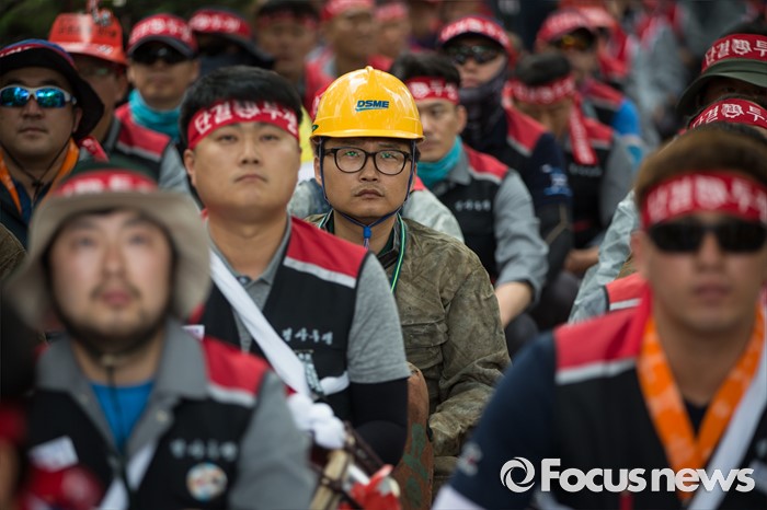 (서울=포커스뉴스) 이틀 전 총파업을 결의한 대우조선해양 노조원들이 16일 오후 서울 여의도 산업은행 앞에서 사측의 일방적 구조조정에 반대하며 상경투쟁을 벌이고 있다.