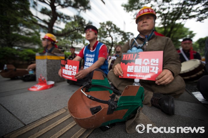 (서울=포커스뉴스) 이틀 전 총파업을 결의한 대우조선해양 노조가 16일 오후 서울 여의도 산업은행 앞에서 사측의 일방적 구조조정에 반대하며 상경투쟁을 벌이고 있다.