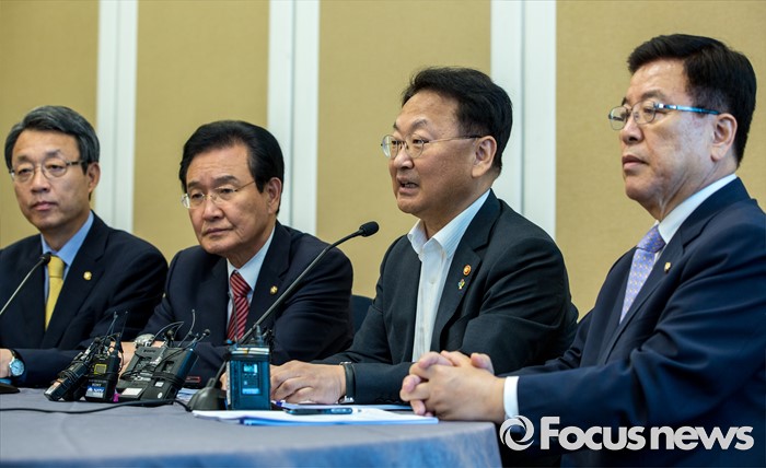 (서울=포커스뉴스) 16일 오후 서울 여의도 국회에서 열린 '2차 민생경제 현안점검회의'에 참석한 3당 정책위의장과 경제부총리가 회의 시작에 앞서 모두발언 하고 있다. 왼쪽부터 김성식 국민의당 정책위의장, 변재일 더불어민주당 정책위의장, 유일호 경제부총리 겸 기획재정부 장관, 김광림 새누리당 정책위의장.