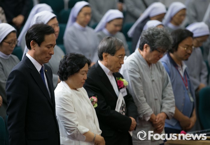 (서울=포커스뉴스) 16일 오후 서울 여의도 국회도서관에서 열린 김근태기념치유센터 개소 3주년 2016 국제 고문피해자 지원의 날 행사에 참석한 우상호(앞줄 왼쪽부터) 더불어민주당 원내대표, 인재근 의원, 함세웅 신부 등 참석자들이 나라와 민족, 고문희생자를 위한 목례를 하고 있다.