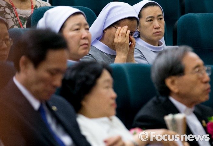(서울=포커스뉴스) 16일 오후 서울 여의도 국회도서관에서 열린 김근태기념치유센터 개소 3주년 2016 국제 고문피해자 지원의 날 행사에 참석한 수녀들이 고문피해자들의 내러티브 연극 '진실을 외쳐라'를 관람하며 슬픔에 잠겨 있다.