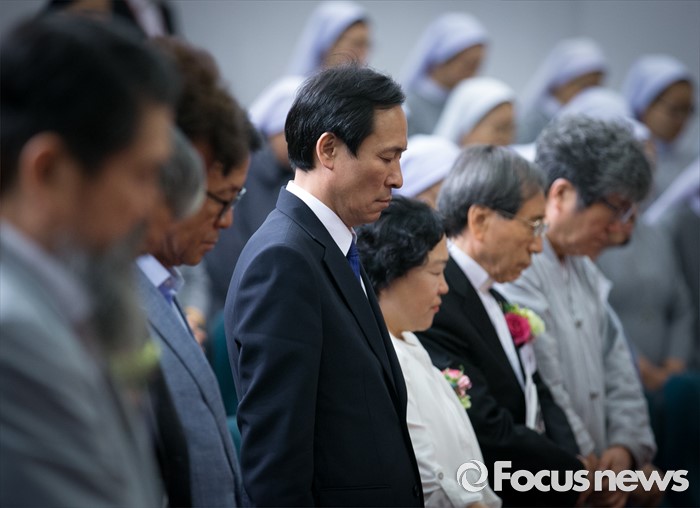 (서울=포커스뉴스) 16일 오후 서울 여의도 국회도서관에서 열린 김근태기념치유센터 개소 3주년 2016 국제 고문피해자 지원의 날 행사에 참석한 우상호 더불어민주당 원내대표, 인재근 의원, 함세웅 신부 등 참석자들이 나라와 민족, 고문희생자를 위한 목례를 하고 있다.