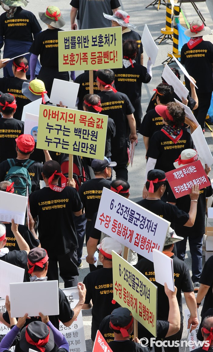 (세종=포커스뉴스) 16일 오후 세종시 정부세종청사 국가보훈처 앞에서 66.25 전몰군경미수당비대위 구성원들이 예산확보를 요구하는 집회를 하고 있다.