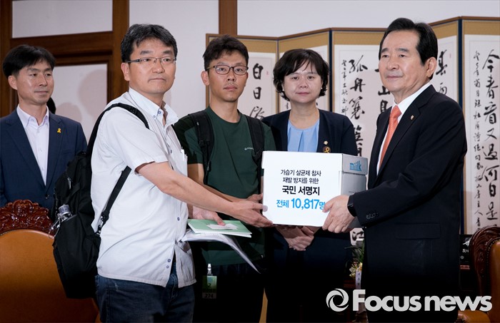 이날 면담에는 가습기살균제 피해자 가족 모임 강찬호 대표 등 9명의 피해자 가족들이 함께 했으며, 가습기 살균제 참사 피해 방지를 위해 1만 800여 명의 대국민서명 용지를 정 의장에게 전달했다.