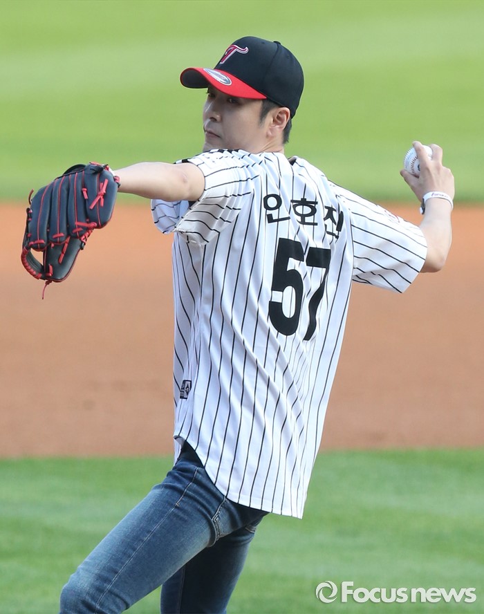(서울=포커스뉴스) 16일 서울 잠실구장에서 열린 2016 프로야구 NC-LG 경기에서 스윗소로우의 가수 인호잔이 시구하고 있다.
