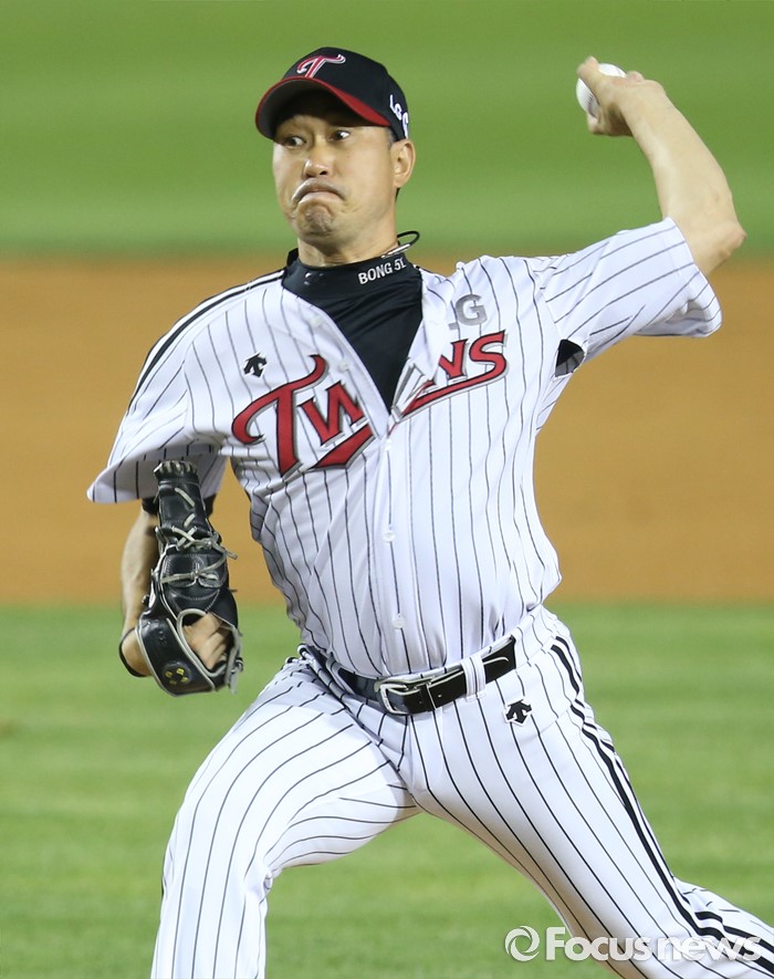 (서울=포커스뉴스) 16일 서울 잠실구장에서 열린 2016 프로야구 NC-LG 경기 7회초 2사 1,2루에서 구원 등판한 LG 봉중근이 힘차게 투구하고 있다.