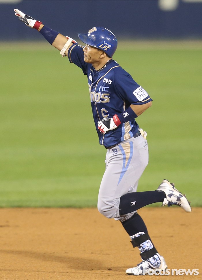 (서울=포커스뉴스) 16일 서울 잠실구장에서 열린 2016 프로야구 NC-LG 경기 9회초 2사 2루에서 NC 이종욱이 우월 2점 홈런을 치고 오른손을 번쩍 들고 그라운드를 달리고 있다.