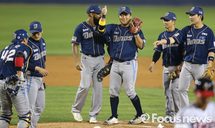(서울=포커스뉴스) 16일 서울 잠실구장에서 열린 2016 프로야구 NC-LG 경기에서LG에 3-0으로 완승한 NC 선수들이 마운드에 모여 12연승을 함께 기뻐하고 있다.