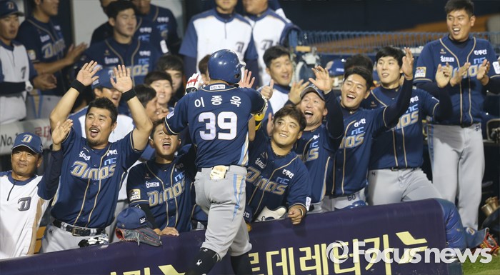 (서울=포커스뉴스) 16일 서울 잠실구장에서 열린 2016 프로야구 NC-LG 경기 9회초 2사1루에서 NC 이종욱이 우월 2점 홈런을 치고 덕아웃에서 동료들의 축하를 받고 있다.