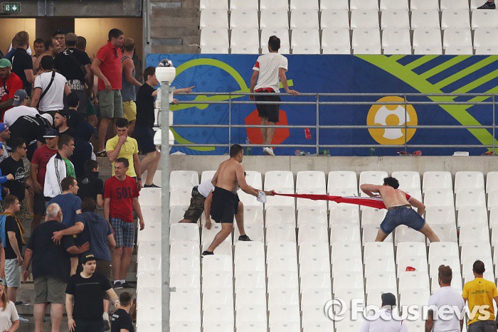 지난 15일에 열린 러시아와 슬로바키아간의 경기에서 폭력사태로 최소 36명이 체포됐고 16명이 병원으로 이송됐다. 프랑스 경찰은 유로 2016 개막 이후로 300명 이상을 체포했다고 밝히기도 했다. 프랑스 내무부에 따르면 이 중 196명은 보호 관리에, 8명은 유죄 판결을, 3명은 집행유예를 받았다.(마르세유/프랑스=게티/포커스뉴스) 프랑스 마르세유에서 지난 12일(현지시간) 열린 유로 2016 B조 1차전 잉글랜드-러시아전 경기장에서 양국 축구팬 사이에 폭력 사태가 일어났다. 2016.06.16 ⓒ게티이미지/이매진스 (마르세유/프랑스=게티/포커스뉴스) 프랑스 마르세유에서 지난 12일(현지시간) 열린 유로 2016 B조 1차전 잉글랜드-러시아전 경기장에서 양국 축구팬 사이에 폭력 사태가 일어났다. 2016.06.16 ⓒ게티이미지/이매진스 (마르세유/프랑스=게티/포커스뉴스) 프랑스 마르세유에서 지난 12일(현지시간) 열린 유로 2016 B조 1차전 잉글랜드-러시아전 경기장에서 양국 축구팬 사이에 폭력 사태가 일어났다. 2016.06.16 ⓒ게티이미지/이매진스