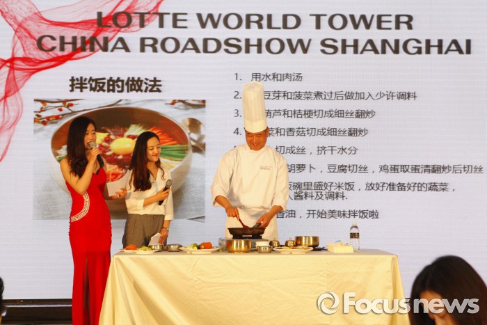 롯데월드타워가 완공되면 기존 잠실 롯데월드를 포함 연간 400만 명의 해외관광객 유치, 매년 약 10조원의 경제적 파급효과가 기대된다.롯데그룹 관광 4개 계열사는 6월16일 중국 상해에서 롯데월드타워 차이나 로드쇼 상하이를 공동 개최했다. 롯데호텔 한식당 무궁화의 총괄셰프인 천덕상 조리장(가운데)이 명품 비빔밥 조리를 시연하고 있다.<사진제공=호켈롯데>