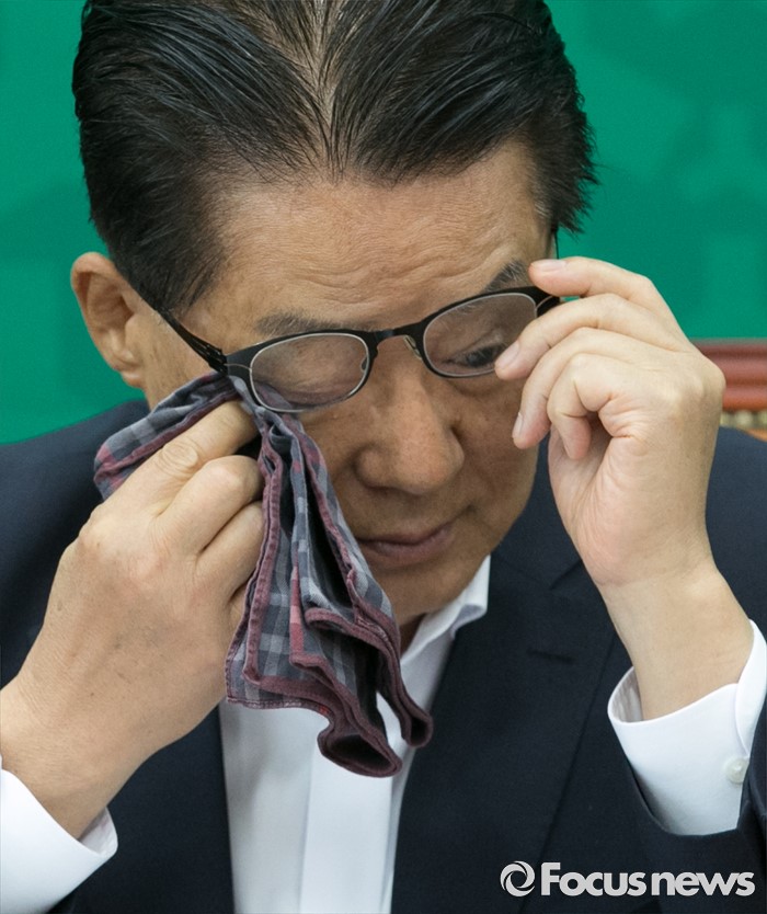 (서울=포커스뉴스) 17일 오전 서울 여의도 국회에서 열린 국민의당 최고위원회의에 참석한 박지원 원내대표가 얼굴을 닦고 있다.