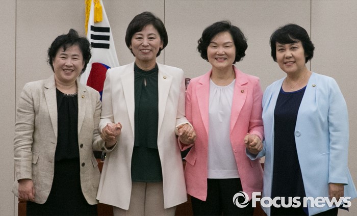 (서울=포커스뉴스) 17일 오전 서울 여의도 국회에서 여성가족위원회 전체회의를 마친 남인순(왼쪽 두번째) 위원장, 윤종필(오른쪽 두번째) 새누리당 간사, 정춘숙(오른쪽 첫번째) 더불어민주당 간사, 신용현 국민의당 간사가 기념촬영을 하고 있다.