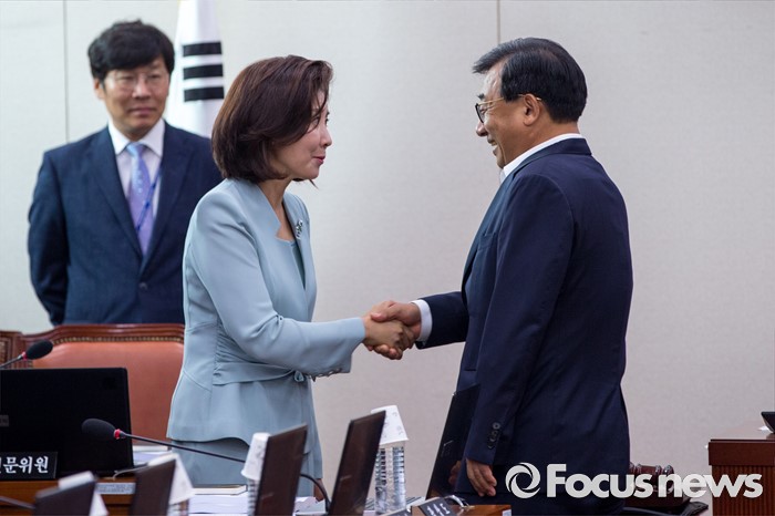 (서울=포커스뉴스) 이정현(오른쪽) 교육문화체육관광위원회 위원과 나경원 위원이 17일 오전 서울 여의도 국회에서 열린 '교육문화체육관광위원회 전체회의'에 참석해 악수 하고 있다.