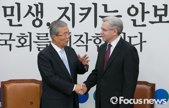 (서울=포커스뉴스) 김종인(왼쪽) 더불어민주당 비대위 대표가 17일 오전 서울 여의도 국회를 방문한 알렉산드로 티모닌 주한러시아대사와 면담에 앞서 인사하고 있다.