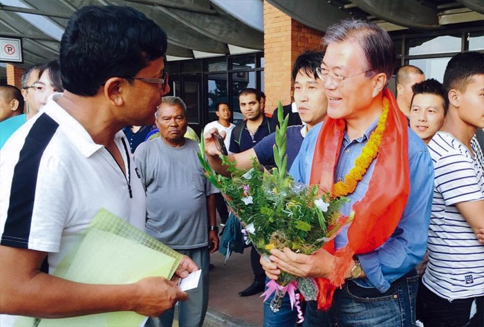 | △ 네팔 도착해 꽃다발 받은 문재인 전 대표 |