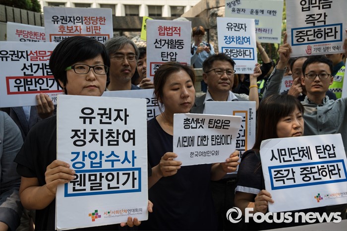 (서울=포커스뉴스) 17일 오후 서울 종로구 서울지방경찰청 앞에서 총선네트워크(총선넷) 회원들이 경찰 과잉수사 및 압수수색 규탄 기자회견을 하고 있다.