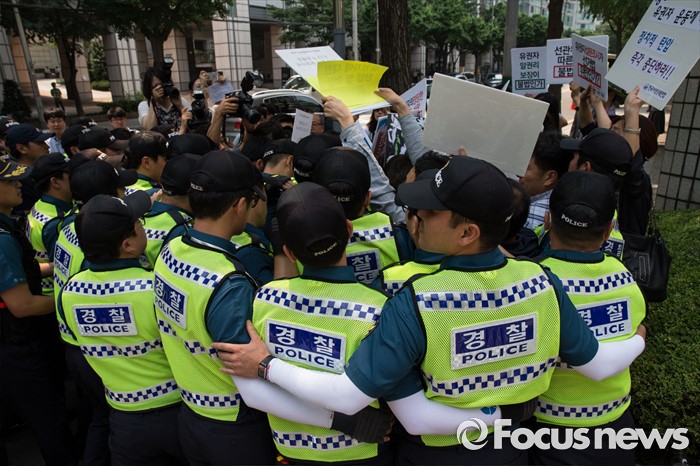 (서울=포커스뉴스) 17일 오후 서울 종로구 서울지방경찰청 앞에서 총선네트워크(총선넷) 회원들이 경찰 과잉수사 및 압수수색 규탄 기자회견을 막는 경찰들과 마찰을 빚고 있다.