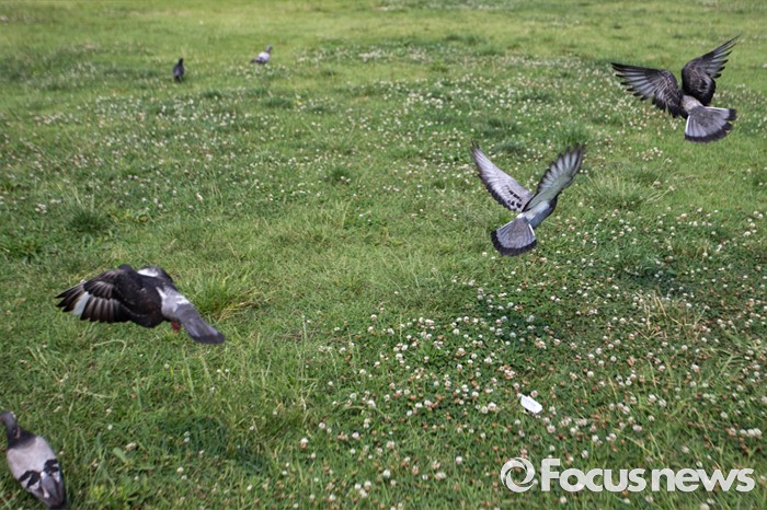 (서울=포커스뉴스) 무더위가 기승을 부리고 있는 17일 오후 서울 반포한강공원에서 비둘기들이 초록빛 잔디밭 위를 날고 있다.