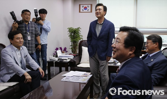 (서울=포커스뉴스) 17일 오후 서울 여의도 국회 의원회관 김태흠 새누리당 의원실에서 조원진, 이장우, 김태흠, 김진태 의원 등 친박계 의원들이 탈당파 복당 문제와 관련 논의를 하고 있다.