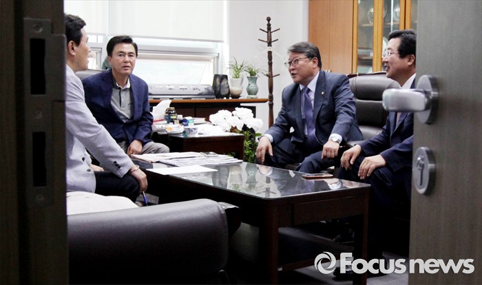 (서울=포커스뉴스) 17일 오후 서울 여의도 국회 의원회관 김태흠 새누리당 의원실에서 조원진, 이장우, 김태흠, 김진태 의원 등 친박계 의원들이 탈당파 복당 문제와 관련 논의를 하고 있다.