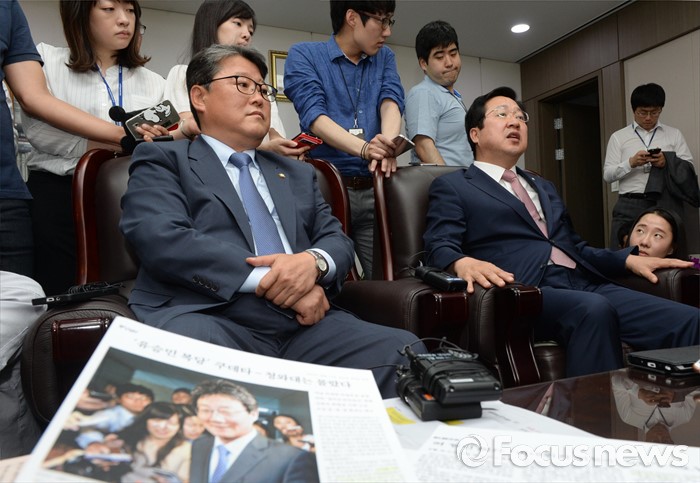 (서울=포커스뉴스) 17일 오후 서울 여의도 국회 의원회관 김태흠 새누리당 의원실에서 조원진, 이장우 의원 등 친박계 의원들이 탈당파 복당 문제와 관련 논의를 하고 있다.