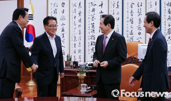 (서울=포커스뉴스) 정세균 국회의장이 17일 오후 서울 여의도 국회 의장집무실에서 3당 원내대표와 현안 논의를 위한 회동에 앞서 인사하고 있다. 왼쪽부터 정진석 새누리당 원내대표, 박지원 국민의당 원내대표, 정 의장, 우상호 더불어민주당 원내대표.