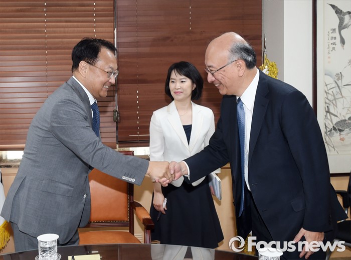 (서울=포커스뉴스) 유일호 부총리 겸 기획재정부 장관이 17일 오후 서울 종로구 서울청사에서 벳쇼 고로 주한 일본대사와 면담에 앞서 악수하며 인사를 나누고 있다. <사진제공=기획재정부>