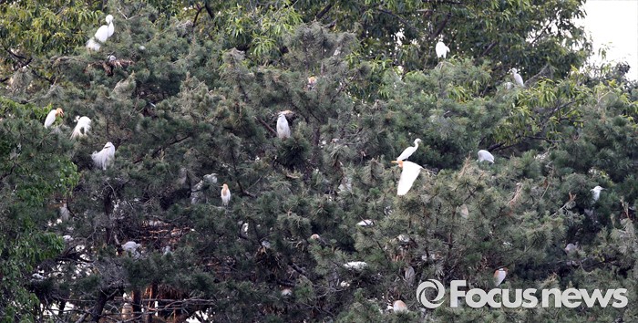 (청주=포커스뉴스) 17일 오후 충북 청주시 서원대학교 야산에 백로 수 백마리가 둥지를 틀고 있다.