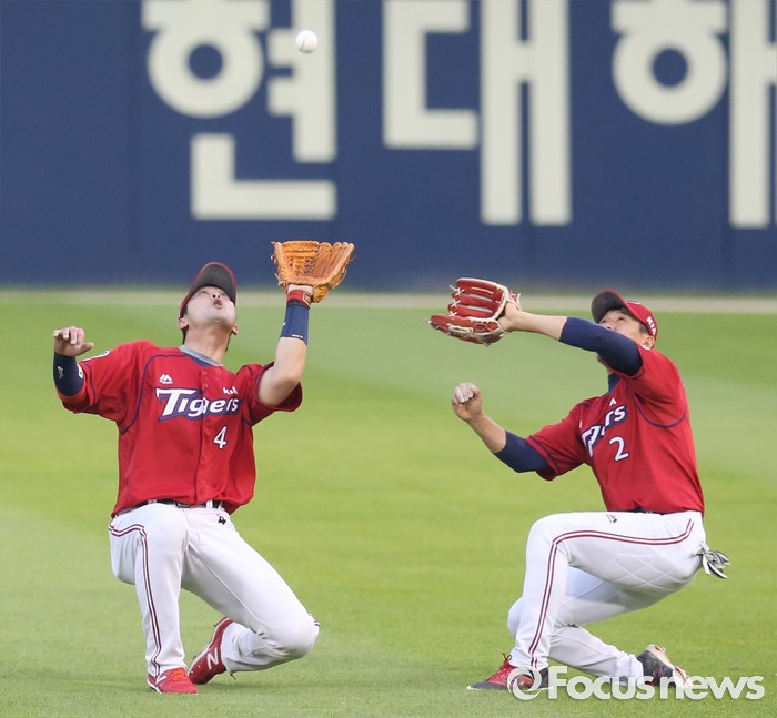 (서울=포커스뉴스) 17일 서울 잠실구장에서 열린 2016 프로야구 KIA-LG 경기 2회말 무사 1루에서 KIA 2루수 서동욱(왼쪽)과 우익수 신종길이 LG 정상호의 뜬공 타구를 잡으려 달려들고 있다.