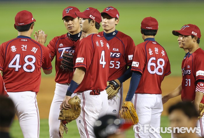 (서울=포커스뉴스) 17일 서울 잠실구장에서 열린 2016 프로야구 KIA-LG 경기에서 LG를 물리치고 5연패에서 탈출한 KIA 선수들이 마운드에 모여 하이파이브하며 승리의 기쁨을 나누고 있다.