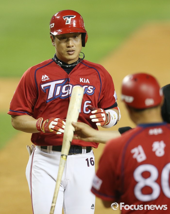 (서울=포커스뉴스) 17일 서울 잠실구장에서 열린 2016 프로야구 KIA-LG 경기 8회초 KIA 선두타자 김주찬이 우월 솔로 홈런을 치고 김창희 코치의 환영을 받으며 홈인하고 있다.