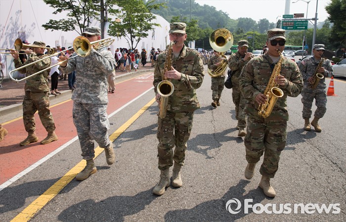 (서울=포커스뉴스) 18일 오후 서울 마포구 평화의 공원에서 열린 '호국보훈 땡큐퍼레이드'에 참가한 미국 군악대가 행진하고 있다.